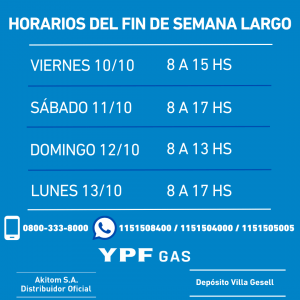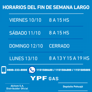 De esta manera, desde Akitom SA, Distribuidor Oficial de YPF Gas, brindamos el servicio con una amplia disponibilidad horaria durante todos los feriados del año.