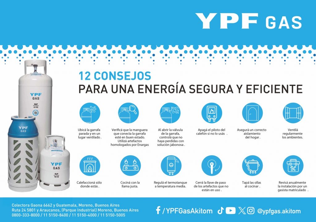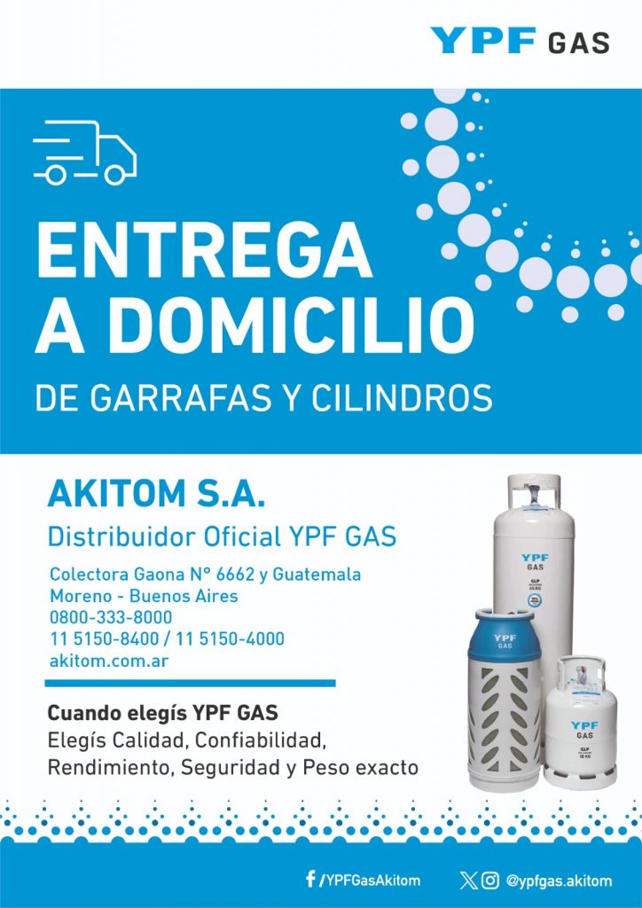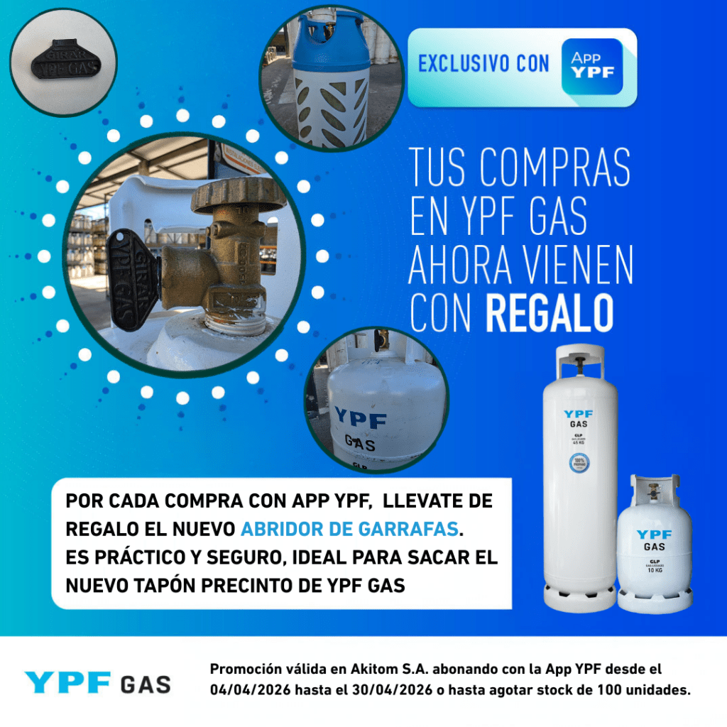 Desde Akitom S.A., junto a nuestra red de comercios y estaciones de servicio que eligen comercializar a la marca líder en calidad, seguridad y servicio, les ofrecemos el gas envasado en garrafas y cilindros de YPF Gas.